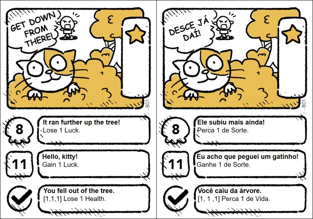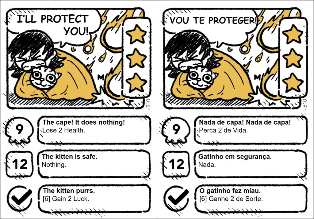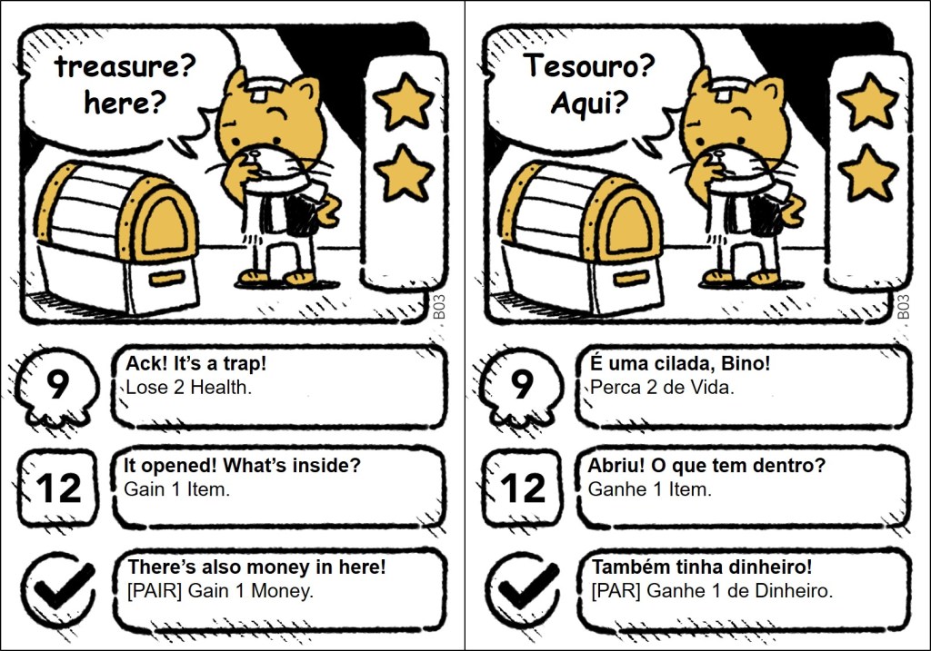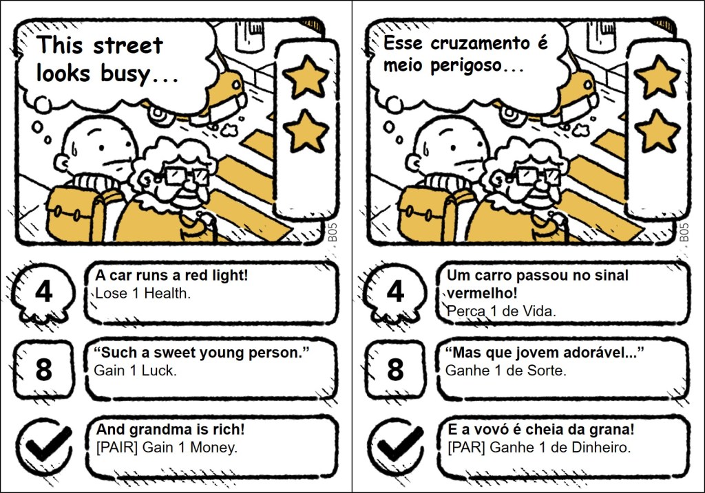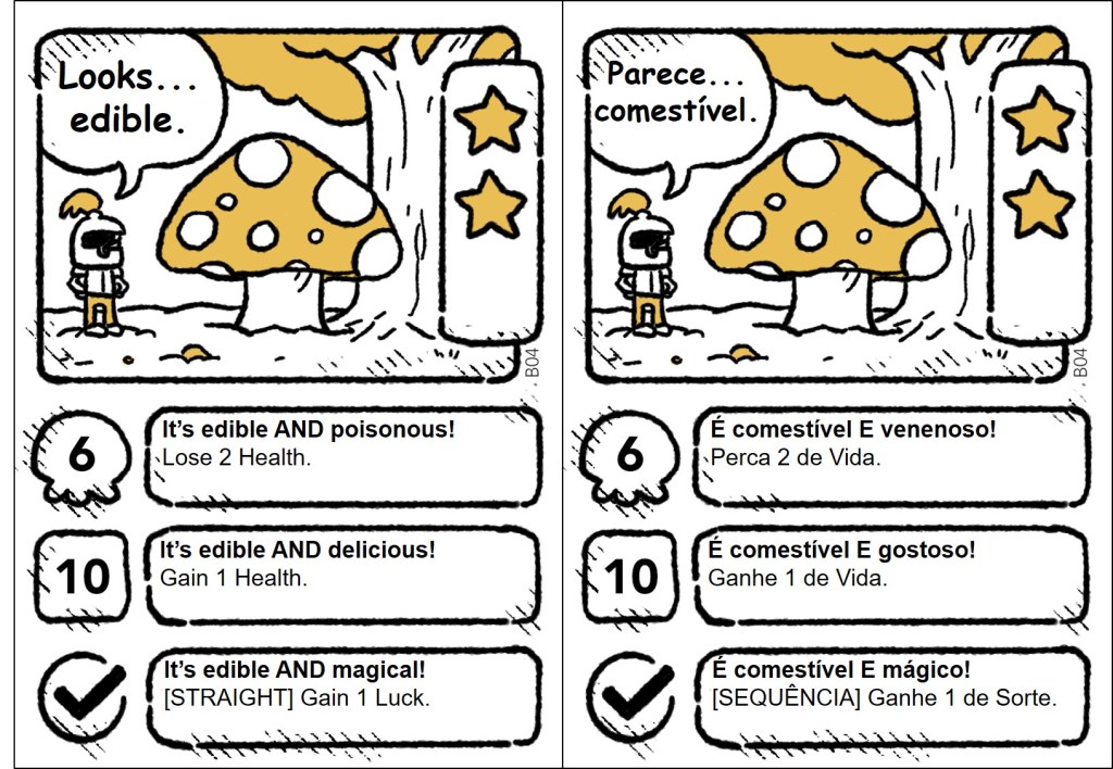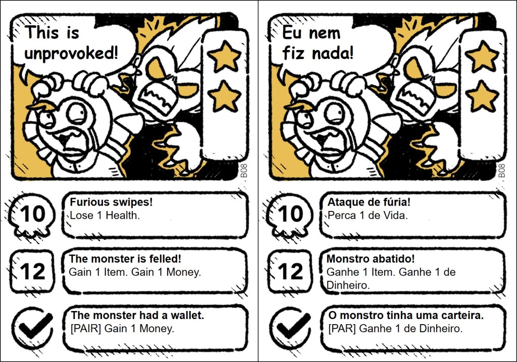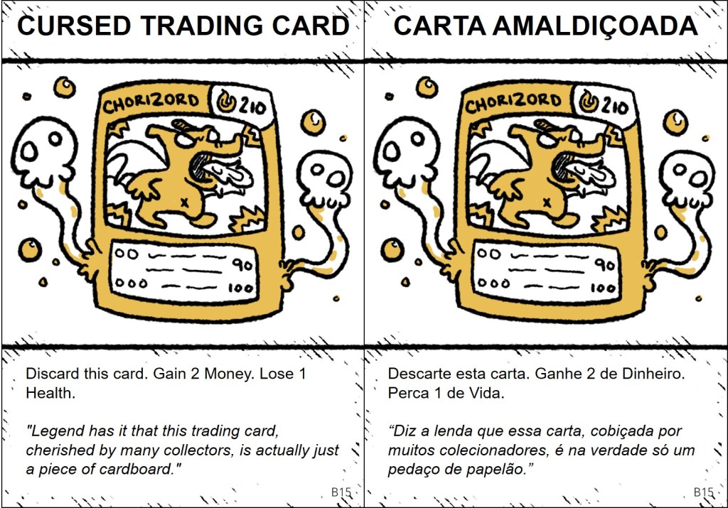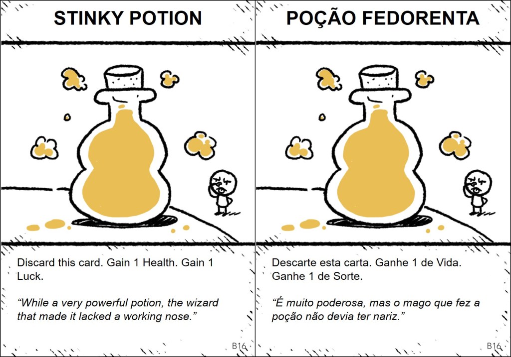 The cards are plenty of jokes, wordplays, and references, and some of them only make sense in English. So, it was important to localize the references, making them understandable and funny for the Brazilian audience. The full project (1,409 words) included the rules and the cards. Here, I share all the quest and item cards in English and my translation into Brazilian Portuguese.